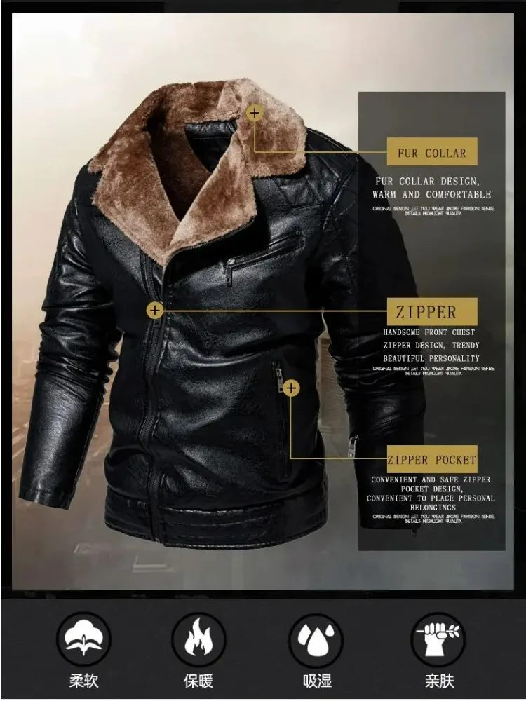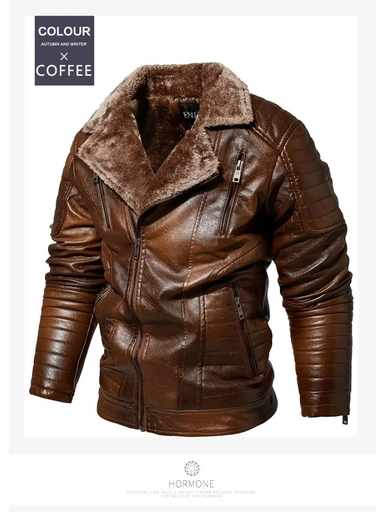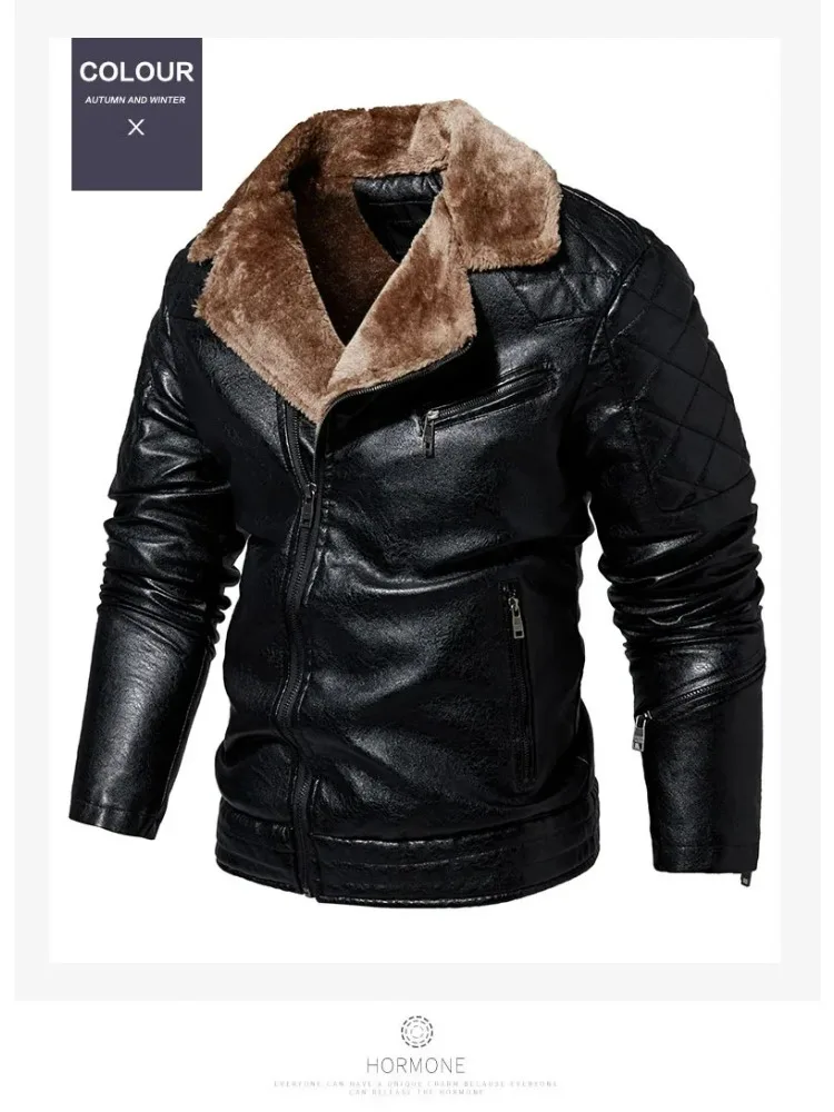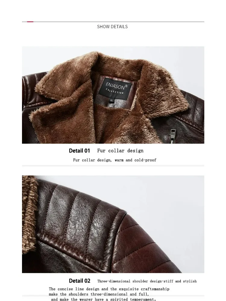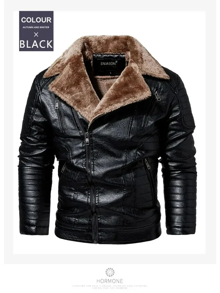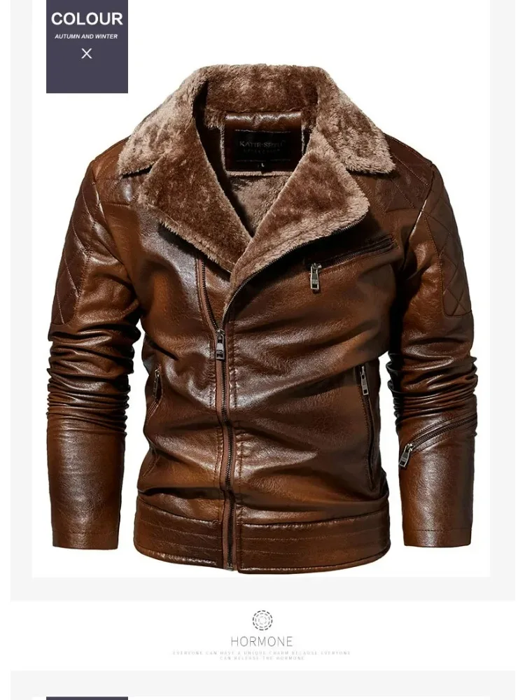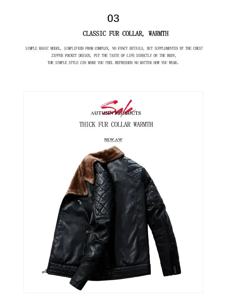 Fashion Warm Winter Mens PU Leather Jacket With Fur Collar Thicken Fleece Motorcycle Coat Casual Faux Leather Locomotive Jacket
