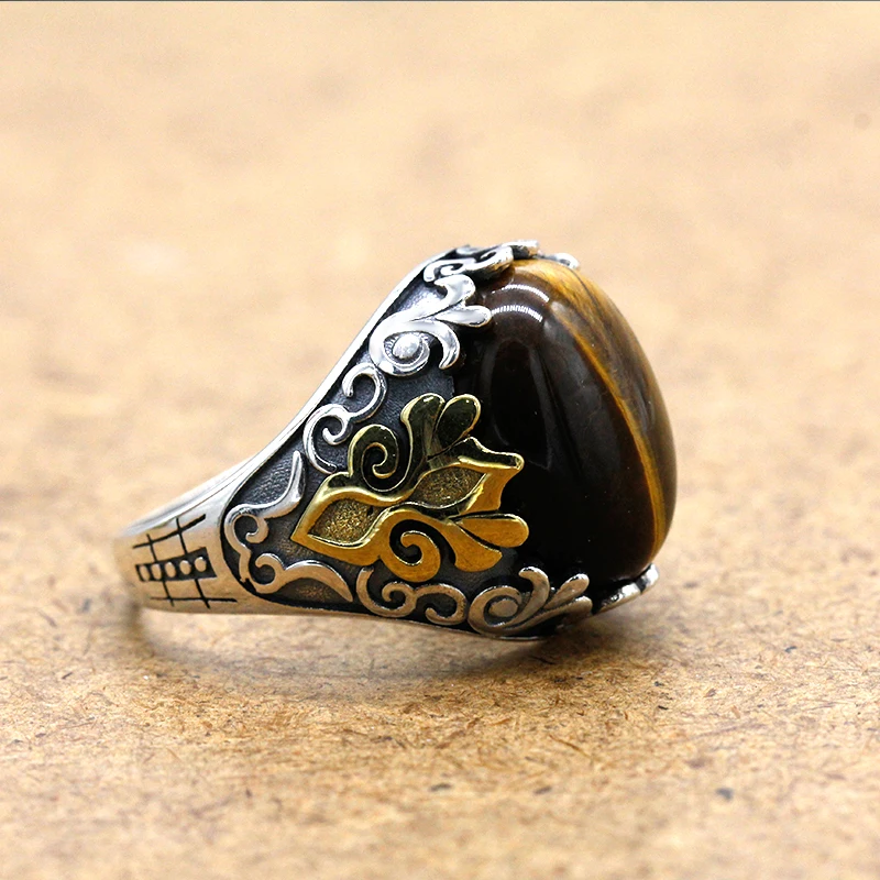 Handmade 925 Sterling Silver Mens Ring With Natural Tiger Eye Stone Oxidized Silver Ring Turkish men's Fashion Jewelry
