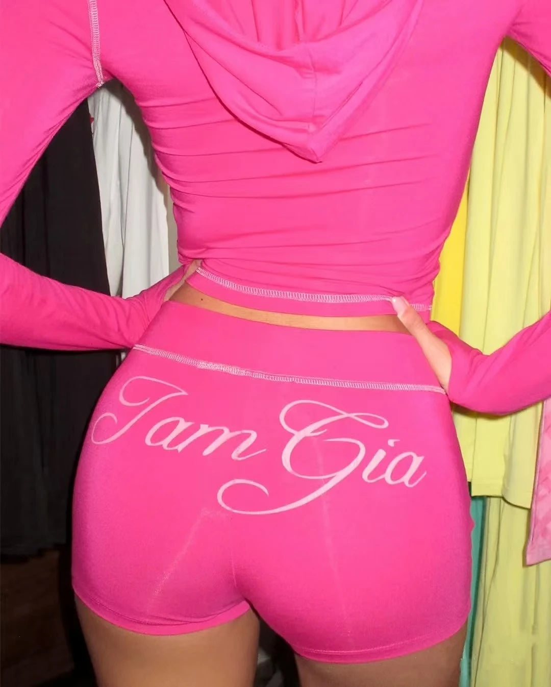 new shoulder letter printed open thread design slim fit hooded zipper short jacket shorts set